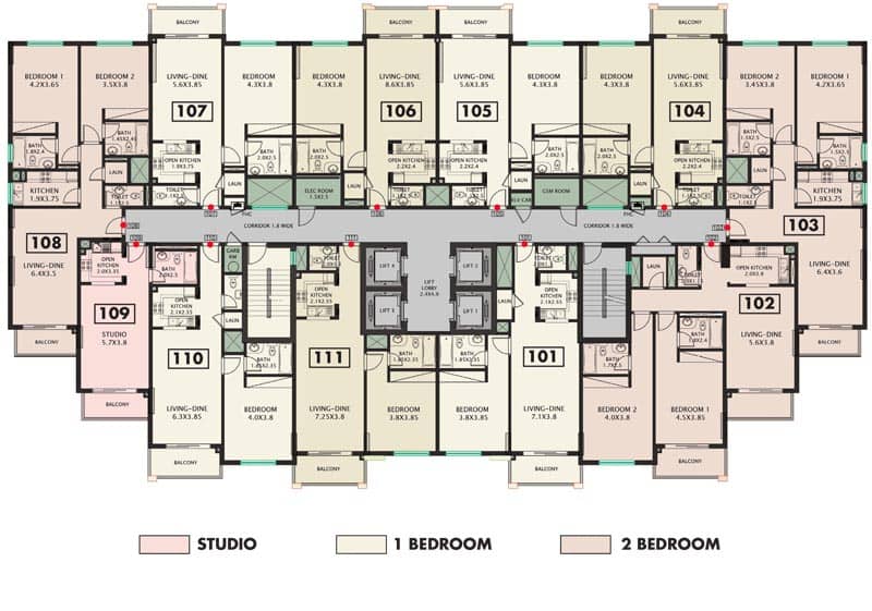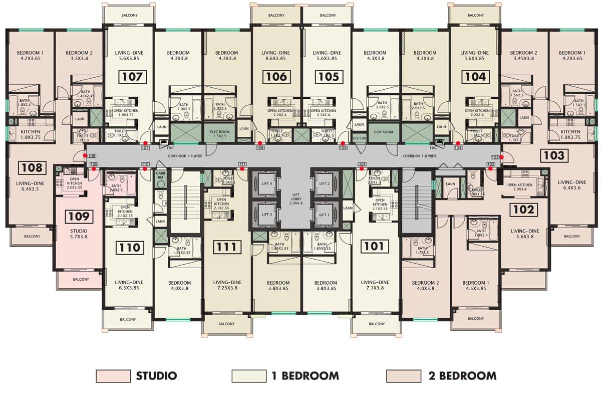 | 101 | 1 BEDROOM | 796 | 89 | 885 |