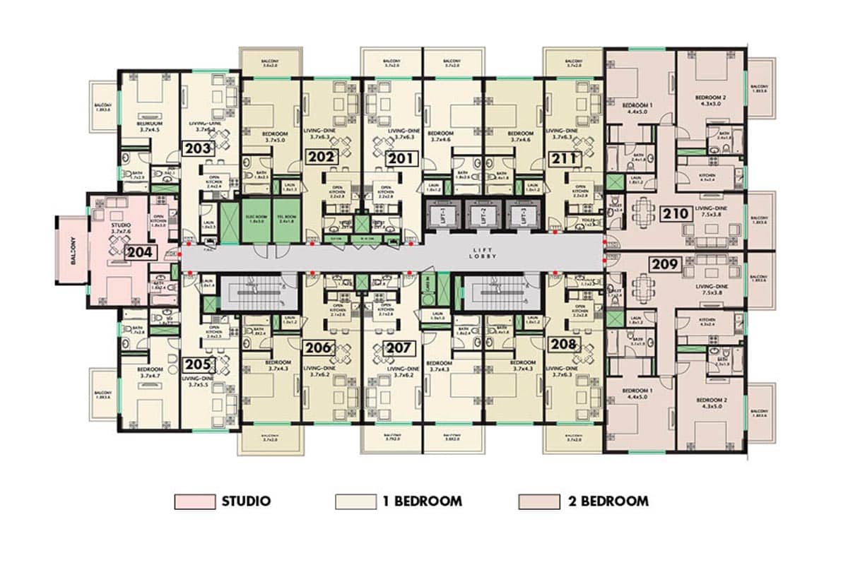| 203 | 1 BEDROOM | 776 | 69 | 845 |